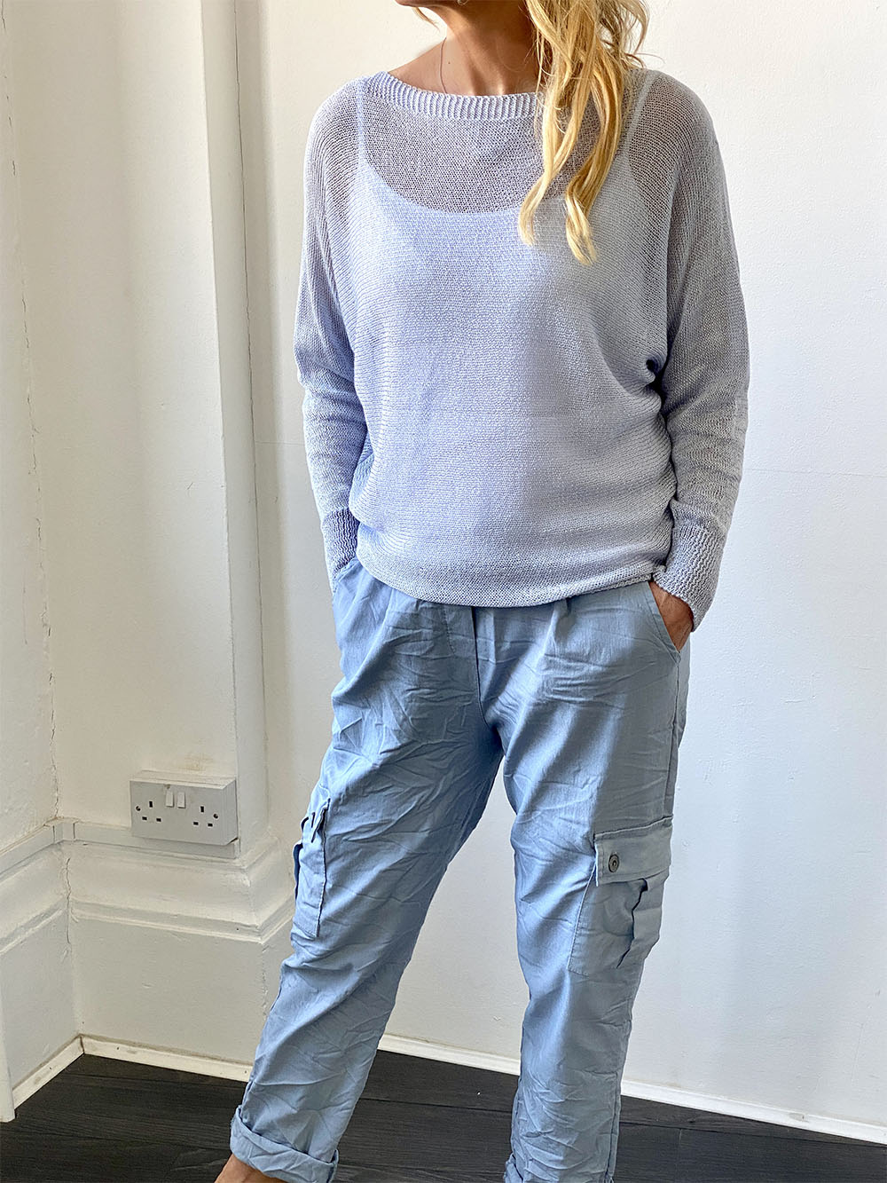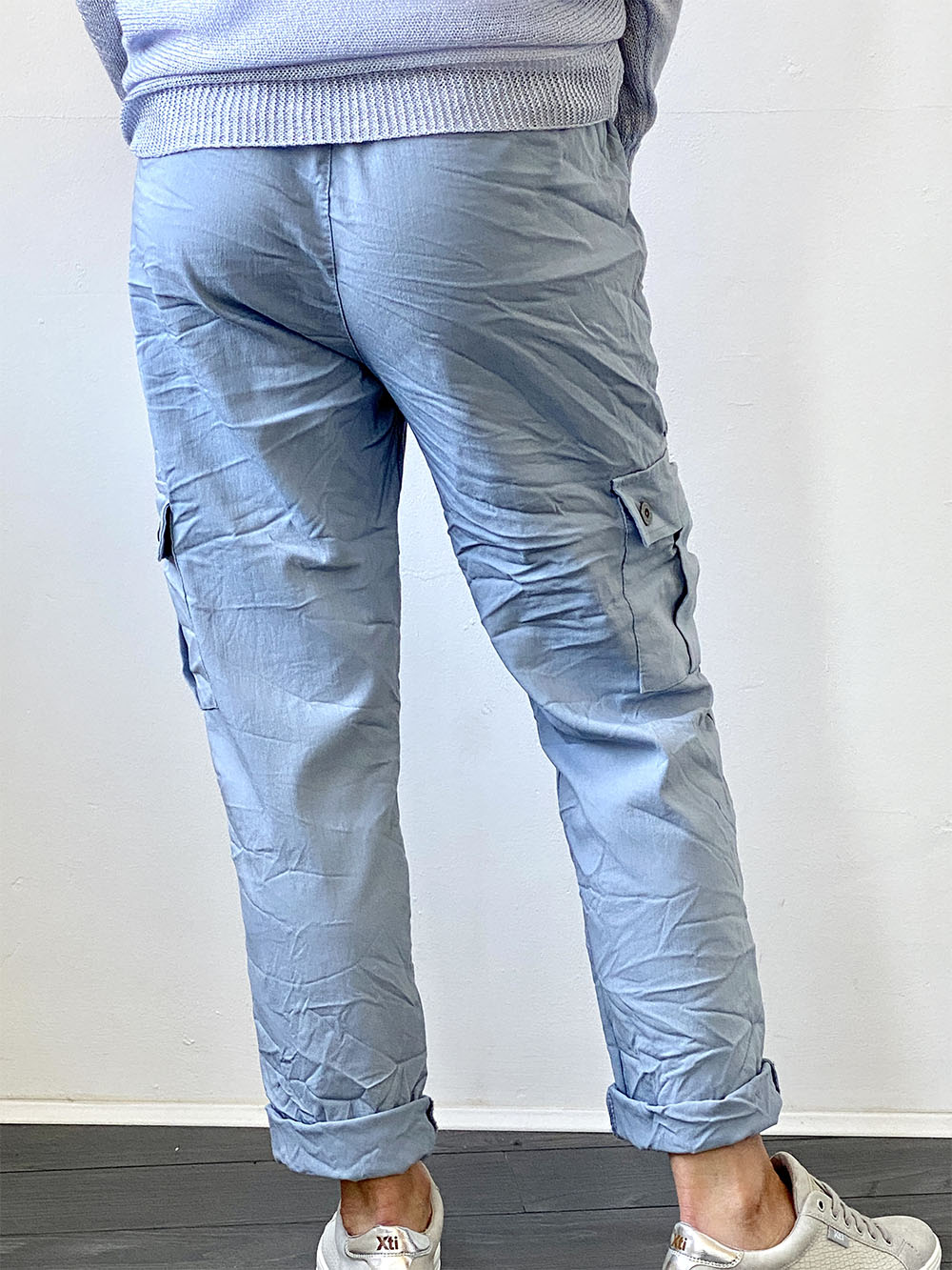These trendy blue combat style pants are great for that active weekend or to lounge around in, extra comfy they have a tie waist, front and side pockets, they are a versatile addition to your wardrobe.