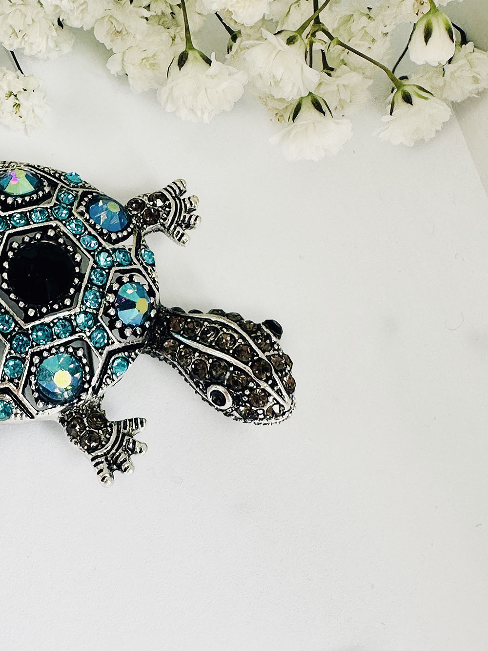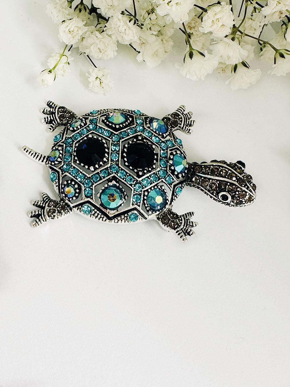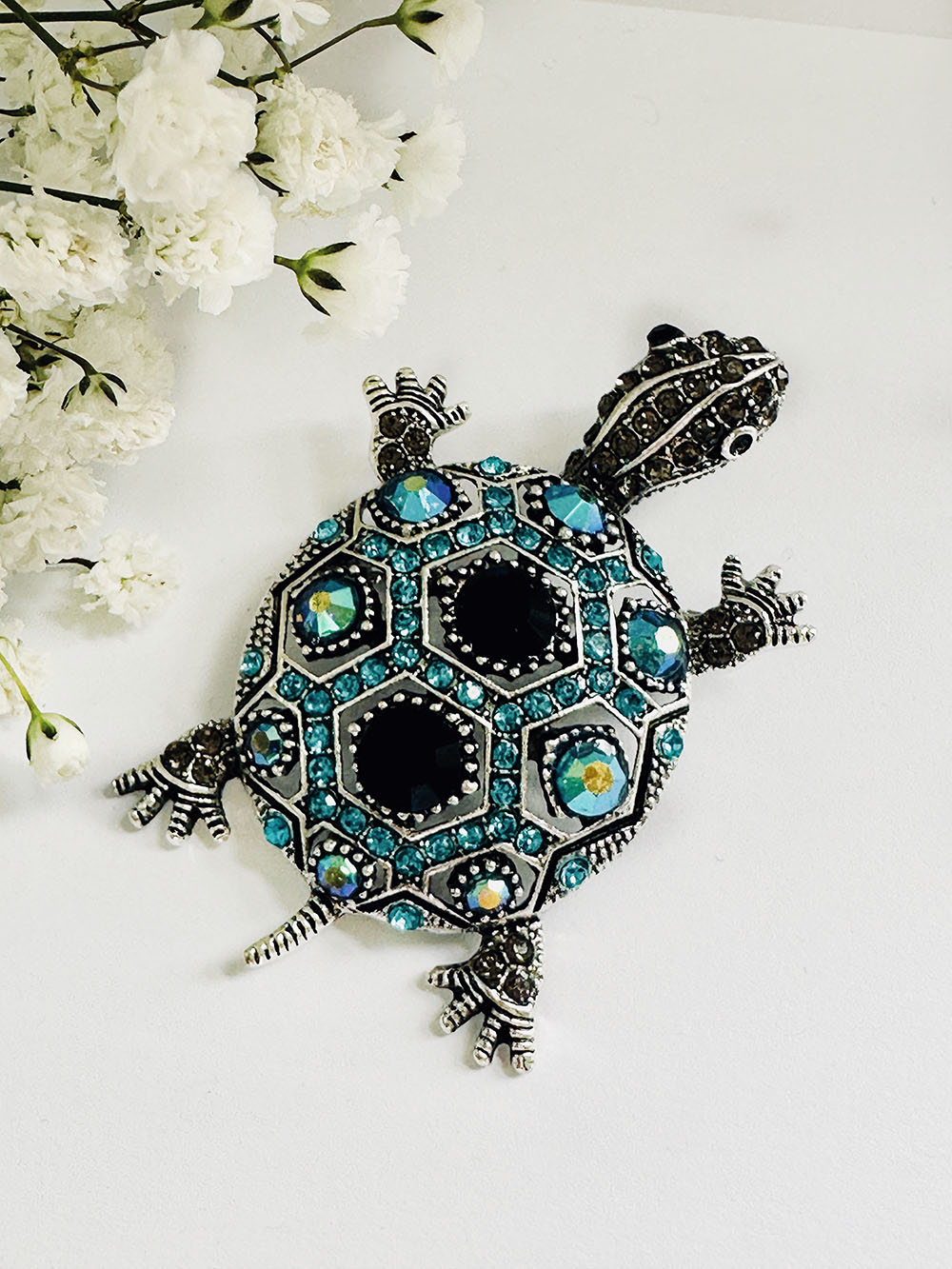 This beautiful Blue Diamante Tortoise brooch will bring a touch of individuality to your day.
