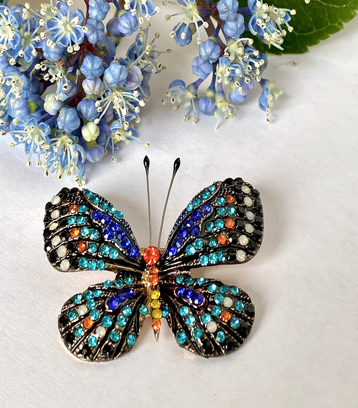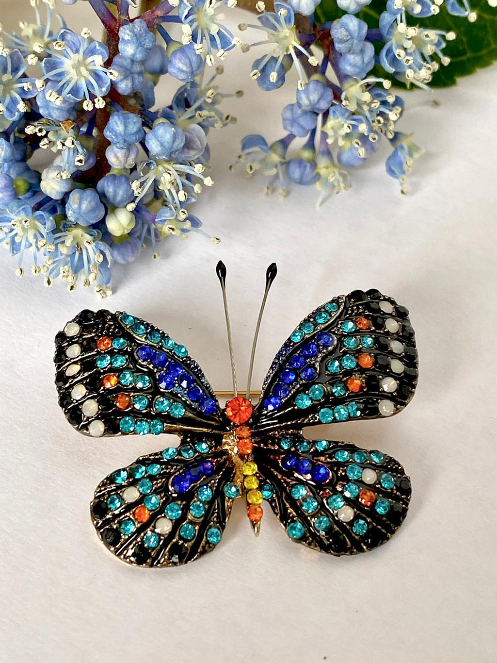 A lovely and colouful rhinestone encrusted brooch in the shape of a butterfly.