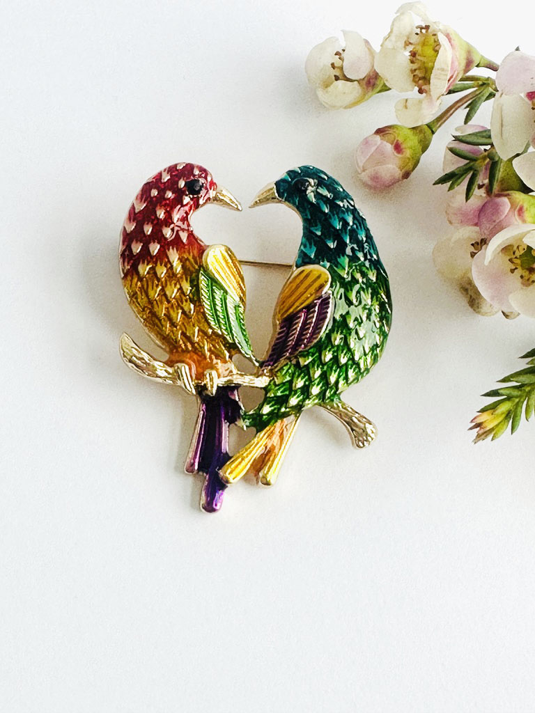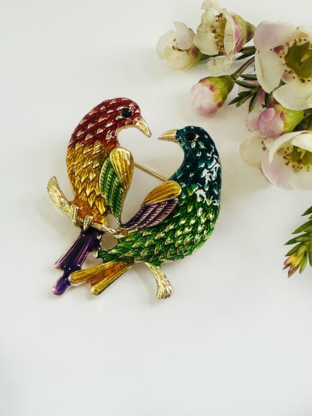Love Nature with this stunning colourful bird brooch, multi coloured feathers create these beautiful birds.