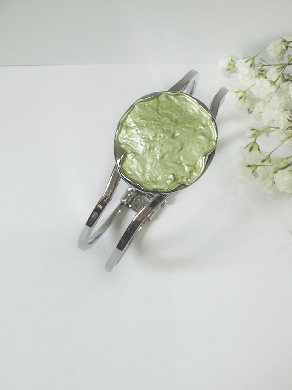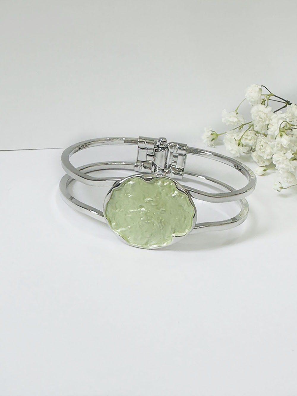 Add trendsetting style to your jewellery collection with this pretty and stylish green hinged bangle, distinctive and colourful this collection consists of unusual and intricate designs.