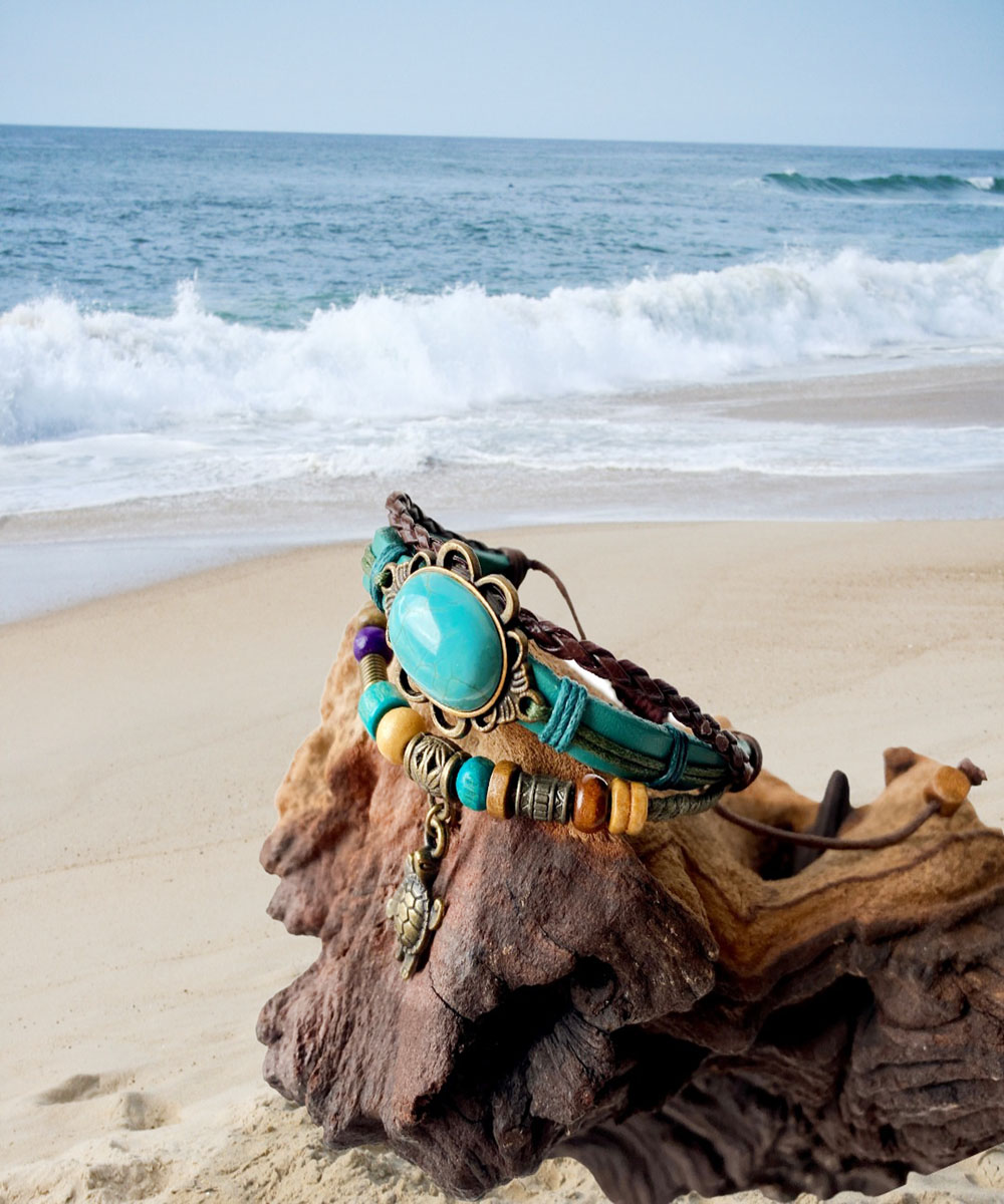 They feature multi leather straps, semi precious stones, beads and pretty charms, they are adjustable and will fit a wide range of sizes with a draw string style fastener.