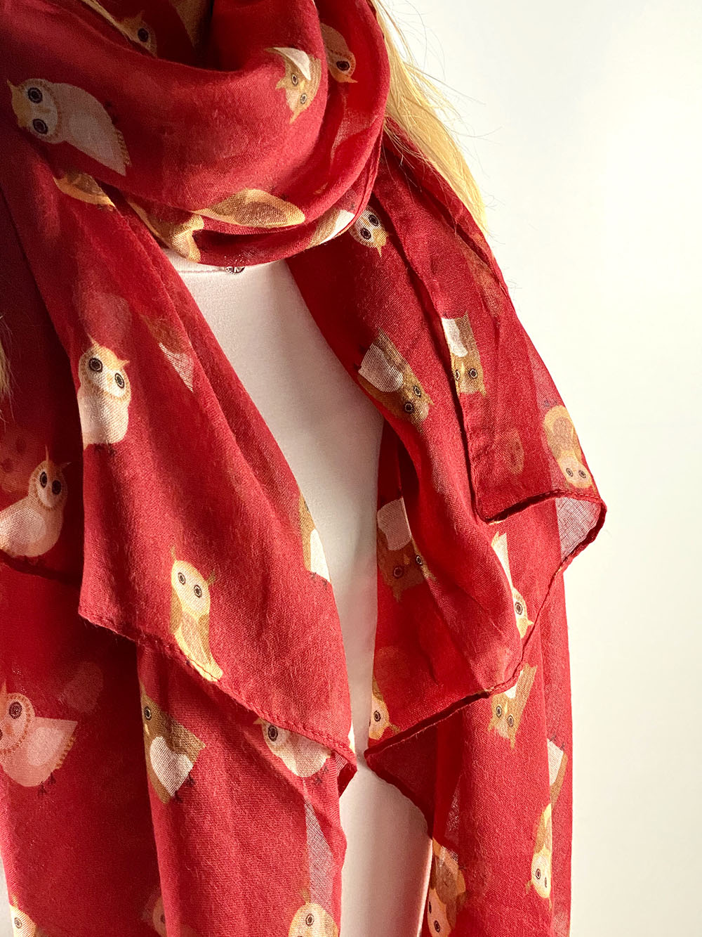 Whether it's style or comfort you're after this soft touch scarf is one of the most versatile accessory trends of the season. This cute red owl print scarf will bring an element of fun to anyone's wardrobe. Will also make an ideal gift for that special person.