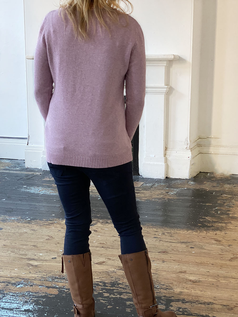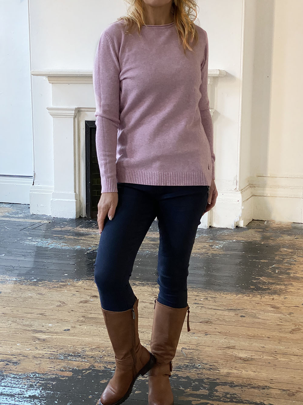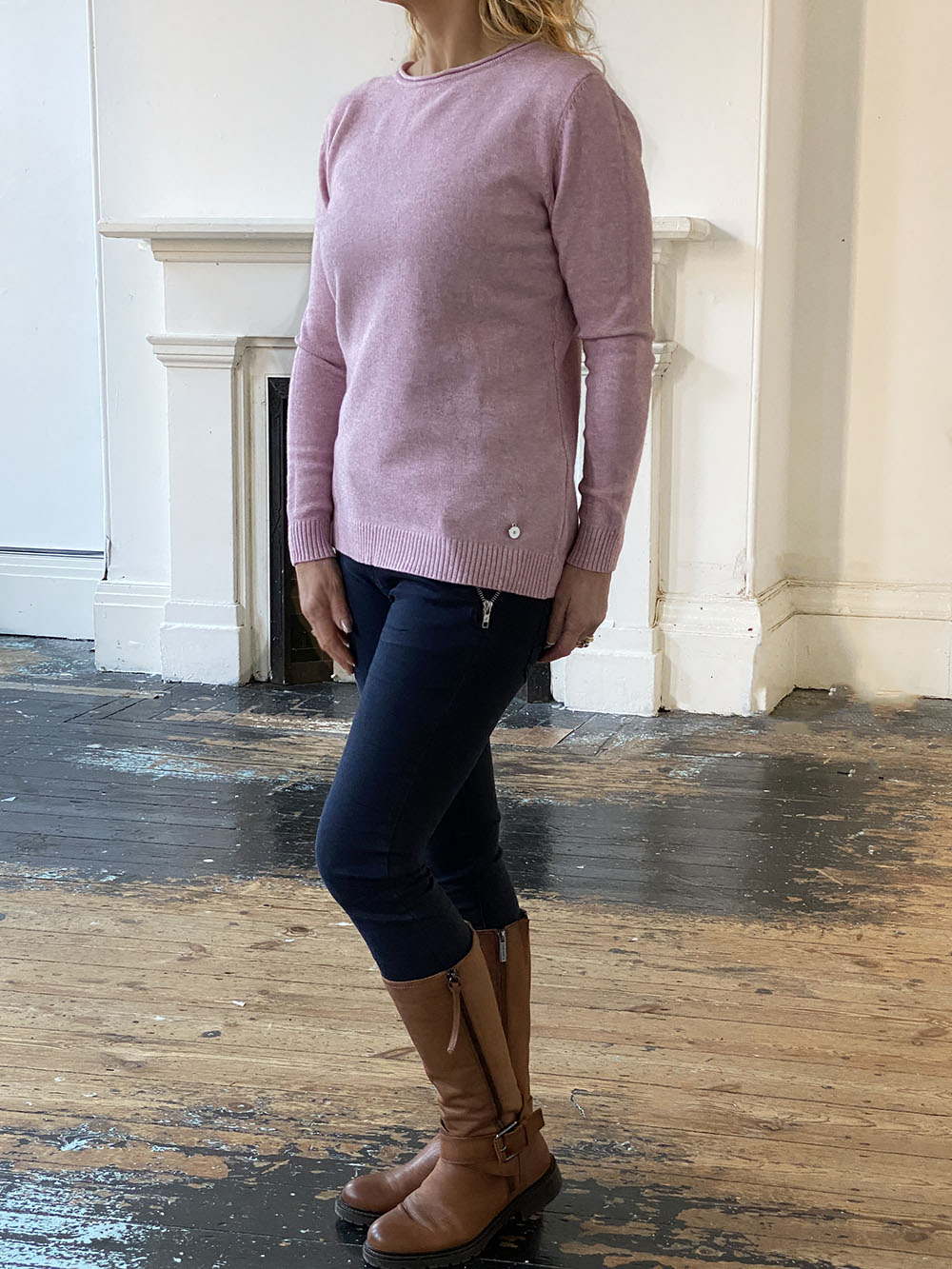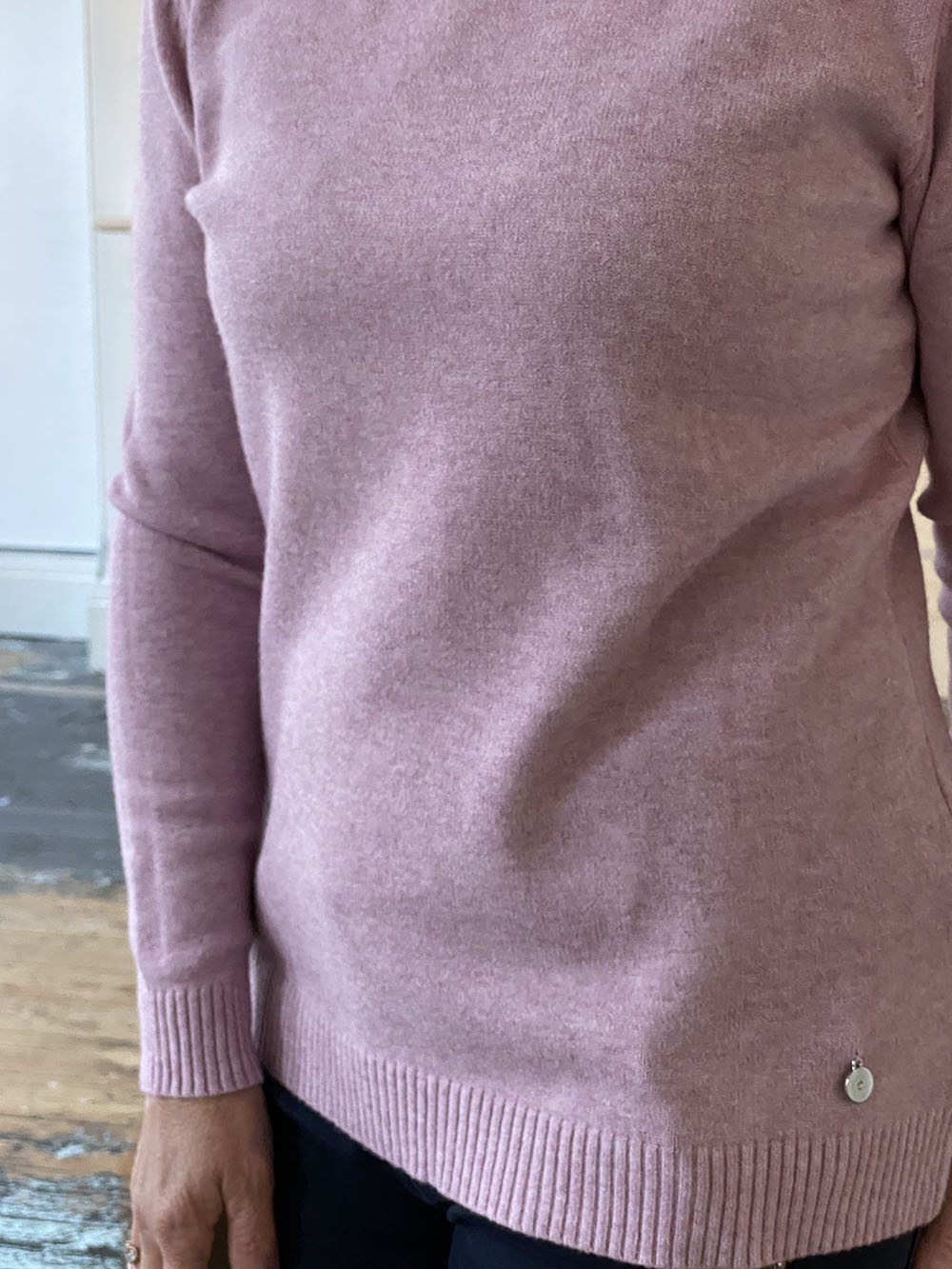 Opt for a versatile mainstay that will stay in fashion year after year with this beautiful soft pink knit lightweight jumper, featuring a classic round neckline, long sleeves and a small silver disc ribbed on the front.