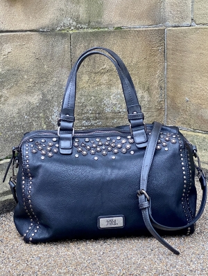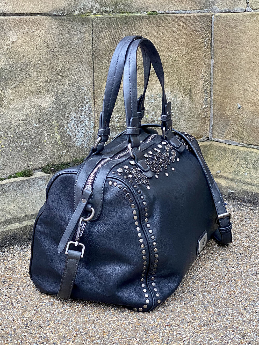 Beautiful black XTI bag, this gorgeous barrel bag has unusual crystal studs on the front, with fine stitching and subtle branding detail. Top zip to keep all your essentials safe, inside there is one large compartment, a zip compartment and two sleeve panels.